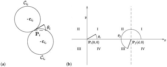 Given an initial configuration and a final configuration , without loss of generality (as in []), it is possible to set and , with d the Euclidean distance between them, as depicted in Figure 1b.