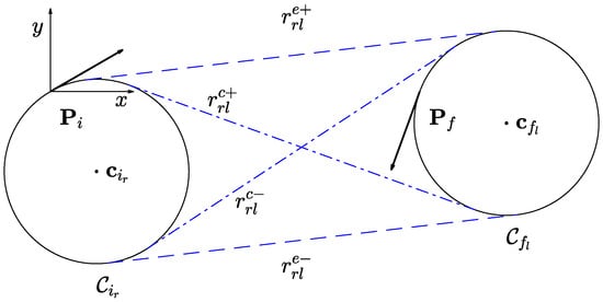 Consider two such circles , with (namely, “initial” or “final”) and (i.e., “right” or “left”); it is possible to identify four different common tangent lines, i.e., two cross tangents and two external ones (see, e.g., Figure 2). We denote all possible common tangent lines between an initial and a final circle as , with , , and (where c and e stand for “cross” and “external”; + and − for “superior” and “inferior”).