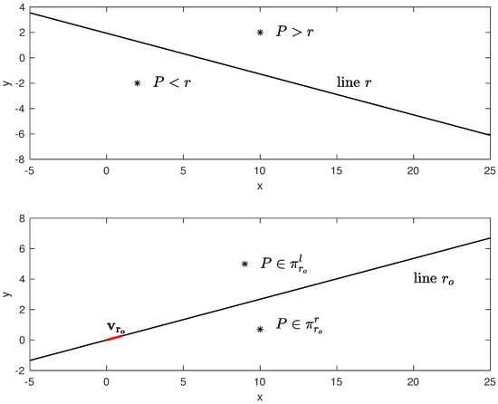 Consider a line r in the Cartesian plane described by all the points satisfying , (see Figure 3); r divides the Cartesian plane into two half-planes. A point is in the upper half-plane if , and it is shortly denoted by . The point P is said to be in the lower half-plane if , denoted hereafter by .