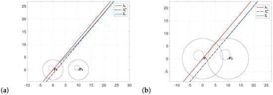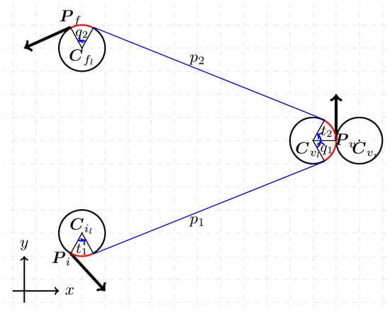 For the path, the segment is given by the common external tangent between the circles and ; while for the path, the segment is given by the common cross tangent between the circles and (see tangents in the Figure 9). As a consequence, the optimality condition in Equation (4) is as follows: