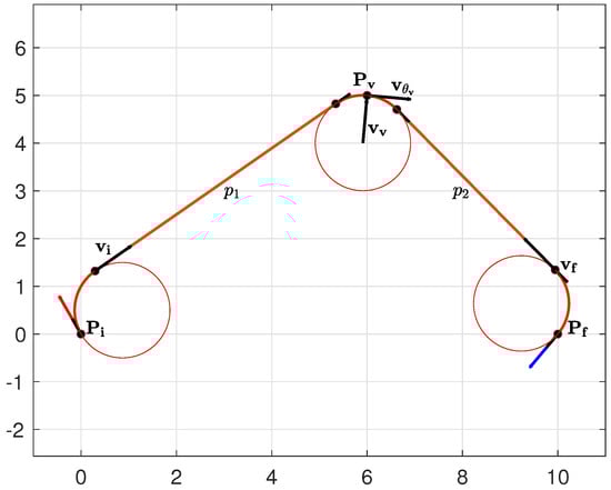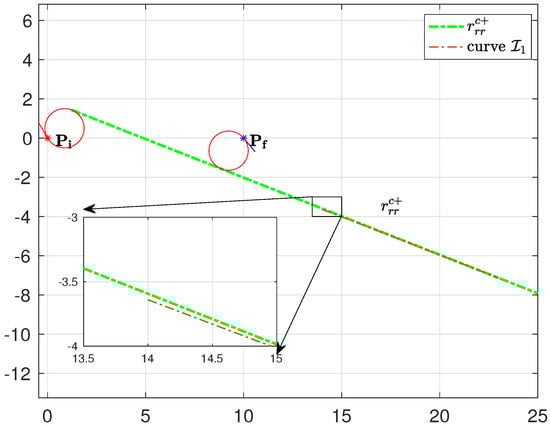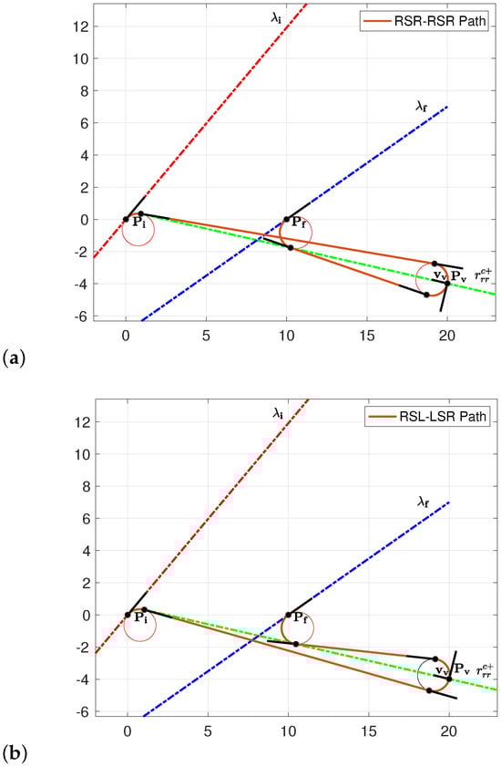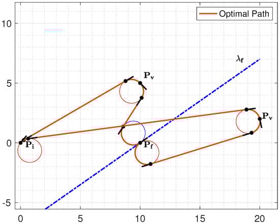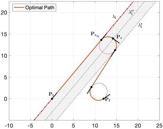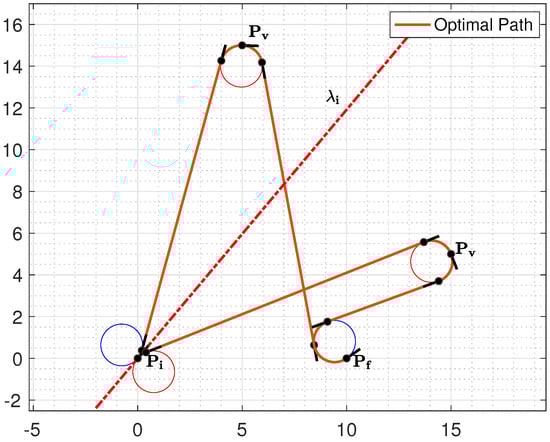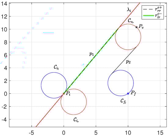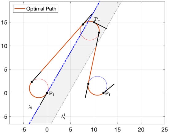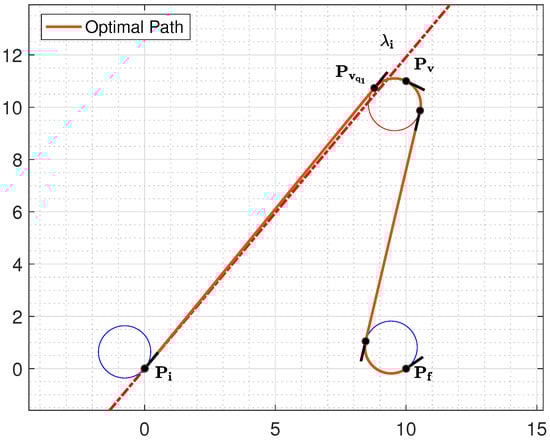 This happens when the circle is tangential to the line ; in this case, the point . As a consequence, the first arc has zero length (i.e., ) and the two paths collapse in a path of type . Refer to Figure 9 for a clear geometric representation of the optimality condition.