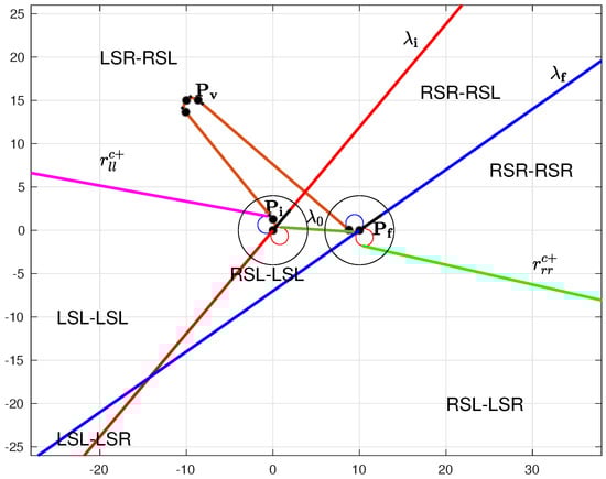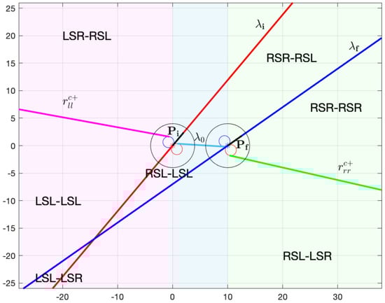 We start with the consideration that paths with zero curvature at the via point are all and only those having the via point on the length-optimal Dubins path between and (see, for example, the light blue line in Figure 15). We denote such an oriented segment (starting from the initial optimal circle and ending at the final optimal circle) as from now on (its orientation is defined as positive from to ). The importance of the segment is that all the via points on the left of () are associated with paths with a right-turn direction at the via point (hence of type ), and those on the right () are paths with a left-turn direction at , i.e., paths.