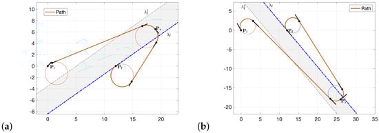 A heuristic solution to determine the initial curvature for points close to is still based on the fact that the boundary is associated with paths having (hence, the first arc of zero length for the example under investigation). As a result, the maximum distance between the point on the frontier and the line is . It is obtained by imposing that the optimal circle at the via point is tangential to the line , or equivalently, for the example under investigation, the first arc of zero length, i.e., . This allows us to consider a region between and the line ( being a line parallel to on its right and distant ) where the investigation should consider two types of potentially optimal paths (either starting with L turn or R turn). This region is highlighted in gray in Figure 11a. A practical way to manage the points in this region is to test both possibilities, which is simpler and less demanding.