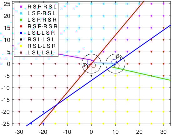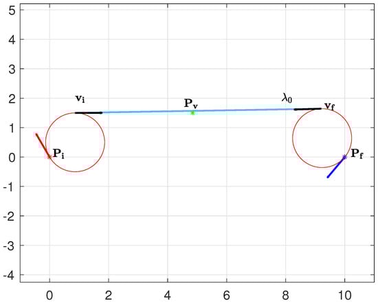 In this section, we provide a simple example to illustrate how the proposed classification rules work, demonstrating the functionality of the proposed algorithms. Let us consider the following initial and final configurations: , , a maximal curvature , and the via point (see Figure 19).