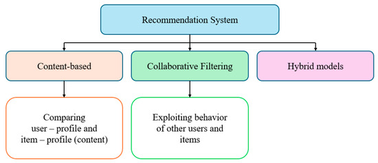 A recommendation system is a subset of machine learning [21,22], defined as a decision-making tool for users navigating complex information environments. It assists in enhancing the social process of utilizing others’ recommendations to make choices when users lack personal knowledge or experience with the alternatives. Recommendation systems can be categorized into three types as in Figure 2.