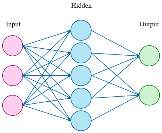 An artificial neural network (ANN) [31,32,33,34,35] is a computational model inspired by the principles of biological neurons. An ANN is defined as a network constructed using computer programming (mathematical functions) that emulates the behavior of a neuron. It receives inputs, performs calculations or makes decisions, and provides outputs, as illustrated in Figure 3.