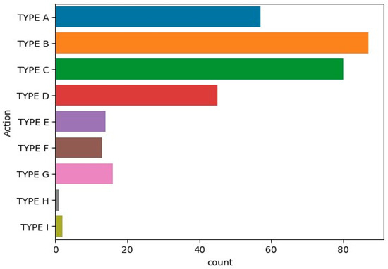 This dataset was obtained through failure analysis (FA), focusing on positions that consistently experience failures. The dataset includes the component serial numbers, specific positions within the components, and the corresponding actions taken for each component. The data span from 23 January to 1 June 2023 and comprise 326 samples used to train machine learning models. The frequency of each action is illustrated in Figure 6.