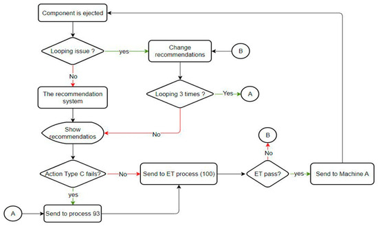 Due to the inability of the production line to control certain situations and outcomes, merely displaying the recommendations is insufficient. Therefore, it was necessary to incorporate additional operational features as illustrated in Figure 9. We also developed a simulation environment to test all the scenarios we designed. These scenarios included (1) a normal situation, (2) a looping issue entering the system, (3) a particular action failure, and (4) an ET test failure.