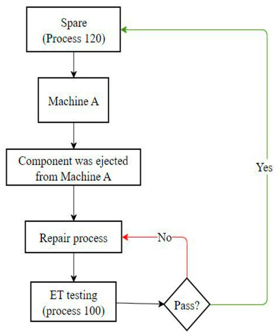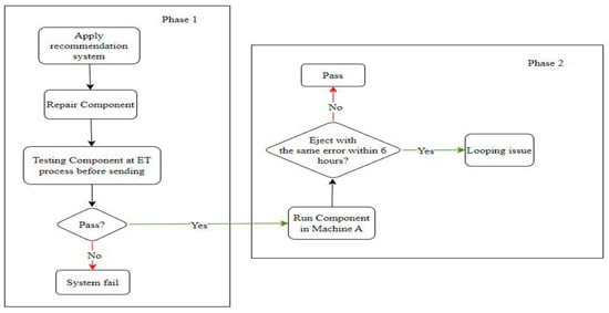 This project necessitates system validation through testing with real data. The validation plan was designed in two phases. The first phase was to validate the operation of the recommender system, which can be accomplished through the ET process. After repair, if the component passes the ET process, the system can recommend appropriate actions. The second phase was to validate the solution for the looping issue. After the ET process, if the repaired component can operate in the Amber testing machine for more than 6 h or fails with a different error, it can be concluded that the component does not have a looping issue. The schematic for the validation plan is shown in Figure 11.