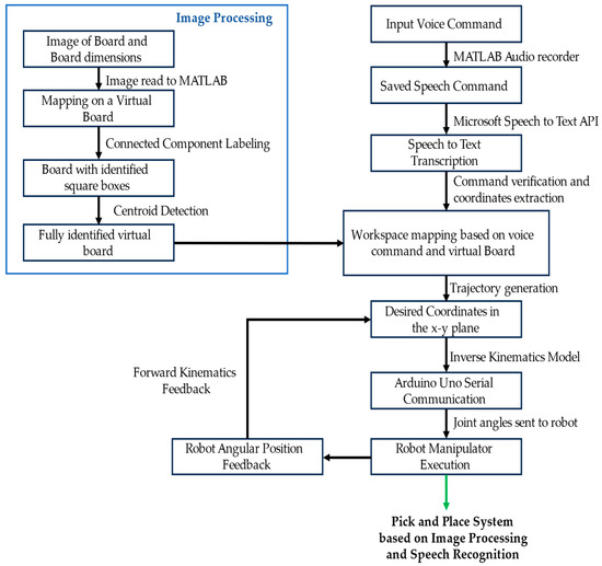 The complete system is a pick and place control, based on image and pattern recognition, for a 3-DoF robot manipulator. This pick and place operation is the foundation upon which the chess-playing robot prototype, which uses voice input to locate the source and destination of the chess pieces, is implemented. The flowchart showing the general overview of the execution base and interdependence of the various modules considered in the methods is shown in Figure 1.
