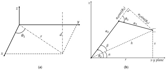 The angle θ2 formed between the shoulder and the arm was obtained by considering the plane formed by the second and third link, as shown in Figure 3b. Angle θ2 is responsible for the horizontal movement of the end effector. In this plane, s is the difference between z (the distance of the end effector from the base) and d (the offset of the shoulder from the base). Angle θ2 can thus be calculated as the sum of angles α and β, and α can be found using the arctangent by considering the right triangle formed by s, h, and r.