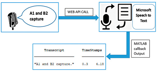For this application, the Microsoft Azure Speech Services API was used while utilizing the credits given per month for a student’s account, for a high accuracy model with a low word error rate. The student account was free for 5 h per month of speech to text transcription, which was adequate given the brevity of the input commands with a maximum command time of 5 s. For the transcription, a speech to text resource group was created in the Microsoft Speech to Text cognitive service [30]. The API was initialized and verified by using subscription keys. On MATLAB R2019b, a speech client was created, and the speech object called, resulting in a http request that, on being successful, had an output of the translated transcription. The process is represented in Figure 5.