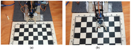 Human–robot interaction is one of many applications seeking to leverage the recent advances in technology to realize the operation of robots in a shared space with people. Based on the review in [1], human–robot interaction is enhanced through the combination of modalities such as voice, vision [2], text, touch, and bio-signals [3] as methods of intercommunication. Some of the collaboration efforts have been directed towards elderly care, addressing the challenges of aging populations [4,5], in addition to physically assistive robots [6]. Board games, such as chess and checkers, provide a rich domain for researching human–robot cooperation due to their structured yet flexible nature [7]. Chess, a two-player strategy board game played on a checkered board in an 8 × 8 grid, serves as an excellent testbed for developing general human–robot cooperation systems requiring perception, reasoning, and manipulation of physical pieces. It is characterized by turn-taking in moving pieces to either an unoccupied square or one occupied by an opponent’s piece. The defined and easy to understand rules make chess an appealing choice for incorporating robotic systems. Progress made on the incorporation of robots in board games can in turn pave the way for more general human–robot cooperation systems, not only in industrial applications but also in health, entertainment, and educational fields [8]. Chess is also one of the few games and sports allowing everyone, including disabled individuals, to compete equally under the same standards, fostering an inclusive environment where ratings and international titles are awarded similarly.
