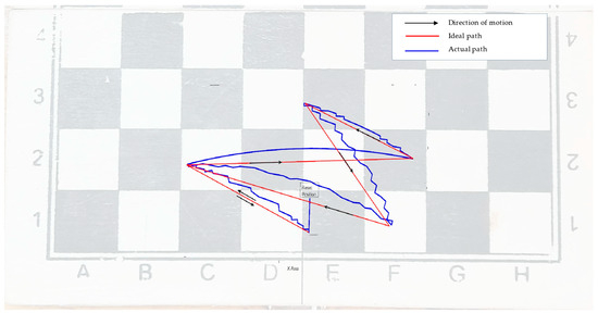 Figure 8 shows the “Ideal path” (red) which is determined as being the shortest path between any two points, which, in the case of a two-dimensional workspace, is a line. The arrows on the “Ideal path” curve denote the direction of movement of the robot motion where, notably, the trajectory generation results in a continuous path from the start to the end without any undesired discontinuity. The “Actual execution path” (blue) curve shows the exact path followed by the end effector of the robot in real-time. This execution path was determined by obtaining feedback from the Arduino to MATLAB and based on the serial communication protocol. The servo reset position is a characteristic of the SG90 micro servos, where whenever the Arduino restarts following the port opening on MATLAB, the servo motors are initialized to 90 degrees.
