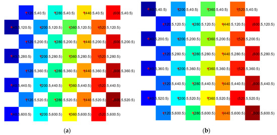 Detected centroids on grid with distinct colors and pixel locations: (a) for white squares; (b) for black squares.