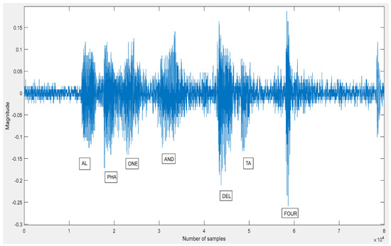 Magnitude spectrum for the input voice command “Alpha 1 and Delta 4”.