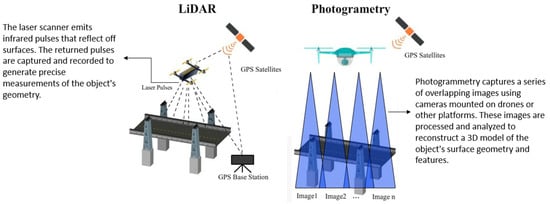 This need for modernization has driven the development of computer vision technologies, which are transforming NDE by automating the process of detecting surface and internal defects such as cracks, corrosion, and structural deformations using advanced imaging systems [11]. Computer vision applies image processing, pattern recognition, and machine learning to automate defect detection, significantly reducing the reliance on human inspection [12]. Modern deep learning algorithms enable automated systems to learn from vast datasets of infrastructure images, identifying even minor defects with high precision [13]. Recent studies highlight the integration of computer vision in various NDE applications, such as crack detection in bridges and corrosion detection in pipelines [14]. Moreover, 3D reconstruction techniques like photogrammetry and LiDAR, as shown in Figure 1, have been instrumental in providing detailed structural models that allow for more accurate geometric analysis and defect detection [15].