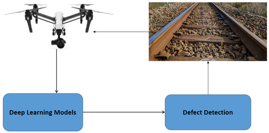 Railway systems are integral to the transportation network, and their safety largely depends on timely defect detection and maintenance. Computer vision-based NDE techniques are crucial in railway inspections, detecting defects such as track misalignments, cracks, and surface wear [59]. Vision-based systems integrated with machine learning algorithms process large volumes of image data from regular track inspections, identifying anomalies in real time and sending alerts for immediate action [60]. Swin Transformers and other hybrid models have been particularly effective in capturing both local and global features, enhancing defect detection accuracy in large-scale railway infrastructures [61]. Automated rail inspection systems reduce downtime and minimize human error, thus improving safety and reducing operational costs [62]. An approach for railway defect detection using drones and deep learning models is shown in Figure 4. A sample of missing fasteners is also shown in Figure 2b.