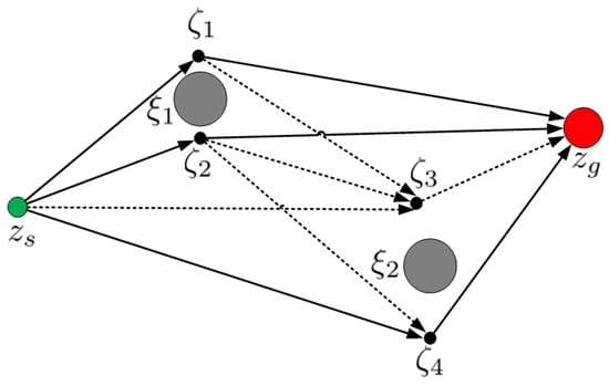 In this context, represents potential waypoints that can be incorporated into the trajectory. The initial phase of exploration is dedicated to generating waypoints that lie between the starting point and the destination . To simplify the model, obstacles are presumed to have a circular form with a predefined radius. Opposite each obstacle, and perpendicular to the line segment connecting and , a pair of prospective waypoints is strategically positioned to the left and right. This initial setup is adequate for generating a subset of unique and viable paths. Figure 2 provides a schematic representation of the obstacle configuration and the corresponding waypoint candidates within a sample environment, where signifies the pivotal point representing each obstacle, and the circle centered at delineates the obstacle region .