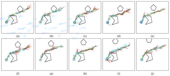 Simulation results of the TACE algorithm. Figures (a–j) are dynamic path trajectory diagrams generated by the TACE algorithm, each representing the result after the obstacle has moved 10 times. The solid black lines represent the obstacle. The red lines represent the branch on the extended tree. The green lines represent the final path. The blue lines represent the sampling area after iteration-based GMM.