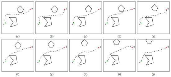 Simulation results of the CE algorithm. Figures (a–j) are dynamic path trajectory diagrams generated by the CE algorithm, each representing the result after the obstacle has moved 10 times. The solid black lines represent the obstacle. The dashed black lines are the final trajectory after 5 iterations.