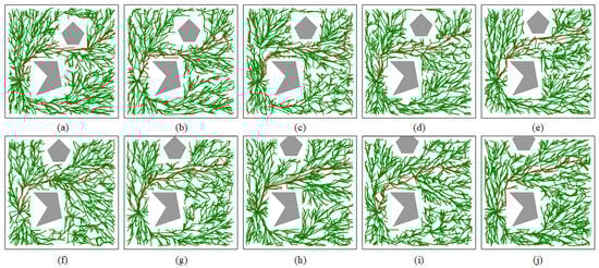 Simulation results of the LQR-CBF-RRT* algorithm. Figures (a–j) are dynamic path trajectory diagrams generated by the LQR-CBF-RRT* algorithm, each representing the result after the obstacle has moved, for a total of 10 times. The solid grey lines represent the obstacle. The green lines represent the branch on the extended tree. The red lines represent the final path.