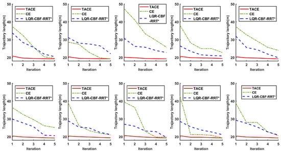 Comparison of algorithm path lengths. The 10 images represent different scenarios generated by moving the obstacle 10 times. The horizontal axis indicates the number of iterations, with the TACE and LQR-CBF-RRT* algorithms iterating 100 times per round. The vertical axis represents the trajectory length from the starting point to the target point. The solid red line represents the TACE algorithm, the green dotted line represents the CE algorithm, and the blue dashed line represents the LQR-CBF-RRT* algorithm.