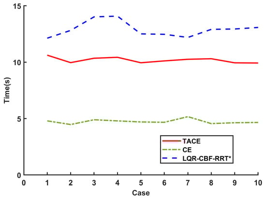 Comparison of the algorithm running time. The horizontal axis represents Case 1 to Case 10 generated by moving the obstacle 10 times. The vertical axis represents the total running time of the algorithm at the end of the iterations. The solid red line represents the TACE algorithm, the green dotted line represents the CE algorithm, and the blue dashed line represents the LQR-CBF-RRT* algorithm.