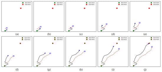 Simulation results of the TACE algorithm in environments with irregularly moving obstacles. (a–j) The 10 frames captured during the motion process. The green dot represents the start point, the red dot represents the goal point, the blue dot represents the robot, and the purple dot represents the dynamic obstacles. The black solid line indicates the robot’s motion trajectory, while the red dashed line represents the motion trajectory of the dynamic obstacles.