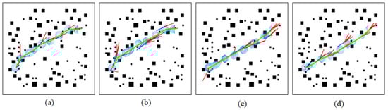 Simulation results of the TACE algorithm in complex environments. (a–d) The path trajectories at iteration numbers 100, 200, 400, and 500, respectively. The black squares represent obstacles. The red lines represent the branch on the extended tree. The green lines represent the final path. The blue lines represent the sampling area after iteration-based GMM.