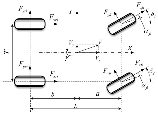 where is the mass of the whole vehicle, is the yaw angular velocity, is the front wheel angle, and are the longitudinal and lateral acceleration, respectively. are the longitudinal and lateral velocities of the vehicle center of mass, respectively, are the front and rear wheel tracks, and are the longitudinal and lateral force of each tire. are the left front wheel, right front wheel, left rear wheel, and right rear wheel, respectively, and is the moment of inertia of the whole vehicle around the z-axis. is the yawing moment.