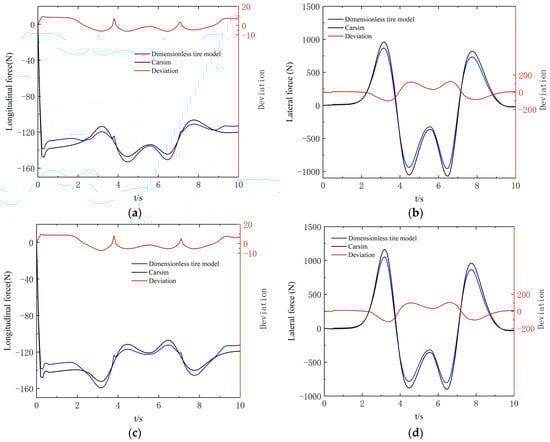 Tire force comparison results: (a) Longitudinal force of left front wheel (b) Left front wheel lateral force. (c) Longitudinal force of right front wheel. (d) Right front wheel lateral force.