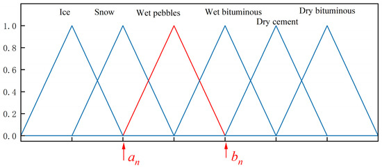As shown in Figure 3, in order to accurately predict the peak adhesion coefficient between typical pavements, it is considered that the target pavement has a certain commonness with two similar pavements. When considering the difference between the adhesion coefficient of the typical pavements and the peak adhesion coefficient, it can be considered that the peak adhesion coefficient law between the target pavement and the typical pavement to be identified is as follows [24]: