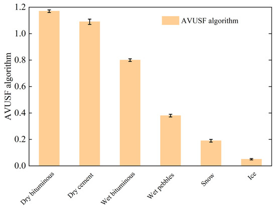 Based on the above methods, dry cement pavement, wet bituminous pavement, wet cobblestone pavement, and snow-covered pavement were identified. The calculated identification results are shown in Figure 4.