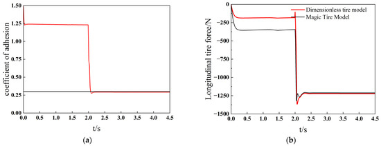 Adhesion Coefficient Estimation Based on the Dimensionless Tire Model: This algorithm establishes a direct mapping relationship between tire mechanical characteristics and peak road adhesion coefficients by analogy with the Burckhardt model. The Unscented Kalman Estimation (UKE) algorithm is used to estimate the adhesion coefficient. Experimental results show that at higher slip ratios, the deviation of the adhesion coefficient is less than 0.05, and the deviation of the tire model is below 7%. The overall estimation is stable; however, the deviation under low slip ratio conditions is relatively large, indicating that further precision improvements are required for low slip ratio conditions.