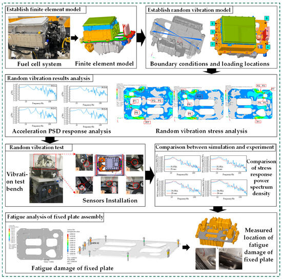 New energy vehicles have emerged as a prominent focus in the automotive industry. This study develops a comprehensive modeling specification for fuel cell systems in new energy vehicles and establishes a framework for fatigue life analysis in the frequency domain. First, a finite element model of the fuel cell system was created in accordance with established standards, followed by grid convergence analysis and grid quality correction to enhance model accuracy. Next, random vibration analysis was performed to determine the root mean square (RMS) stress distribution of the fixed plate assembly in a random vibration environment, and the results were validated through experimental tests. Finally, Miner’s linear cumulative damage rule and the rainflow distribution model for random processes were applied to predict the fatigue life of the fixed plate assembly and connecting bolts. Critical locations for potential structural fatigue were identified, and the simulation results were corroborated through fatigue testing. The findings validate the accuracy of the proposed fatigue analysis framework and offer valuable insights for the continued development of fuel cell systems.