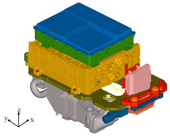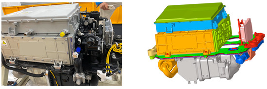 Fuel cells have gained significant traction in the automotive industry owing to their high energy conversion efficiency, low noise levels, and zero-emission characteristics, among other advantages. This study focuses on a hydrogen fuel cell system integrated into a specific vehicle model, as illustrated in Figure 3. The individual components of the fuel cell system are mounted on both the upper and lower surfaces of a support plate via bolted connections or welding. These components are subsequently linked to the vehicle’s body through a suspension bracket. The overall fuel cell system is characterized by a complex assembly of various parts and intricate structural configurations.
