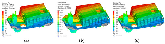 Modal frequencies at different element sizes: (a) 3 mm grid first-order mode; (b) 5 mm grid first-order mode; (c) 8 mm grid first-order mode.