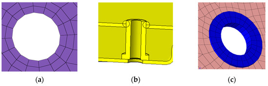 The intercooler, stack housing, and other components are connected to the fixed plate assembly by bolts. Threaded tubes are welded to the corresponding screw holes on the fixed plate. Due to the accumulation of welding materials, the material thickness around the screw holes increases. The cross-section of the screw holes in the CAD model is shown in Figure 7b. Therefore, it is necessary to set the material properties of the elements around the screw holes to have a thicker thickness, as shown in Figure 7c below.