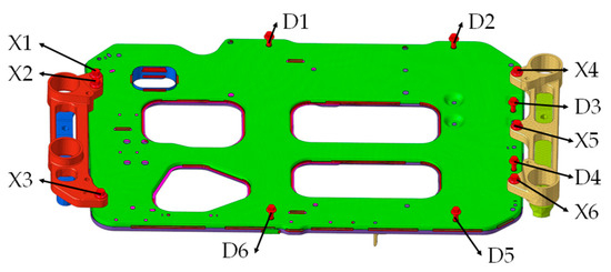 The battery stack assembly and suspension bracket are bolted to the fixed plate assembly, where the bolts experience significant concentrated stress. To assess the fatigue performance of these bolts, detailed modeling is required. The suspension bracket is attached using M12 bolts (X1 to X6), while the battery stack assembly is connected with M10 bolts (D1 to D6), as illustrated in Figure 9. The bolts are meshed with hexahedral elements of 2 mm grid size, and chamfer features are retained.