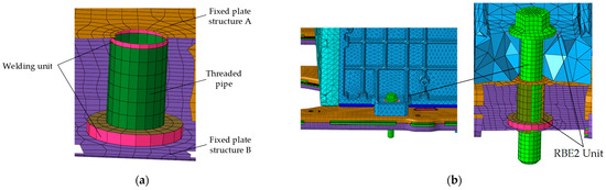 Given the high-stress concentration at the bolted connections, which are prone to random vibration-induced fatigue failure, the bolted connections must be modeled accurately. The structure of the threaded hole is shown in Figure 10, with the threaded pipe connecting the fixed plate components A and C via weld elements.