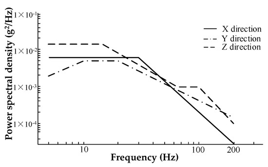 Building on the finite element model from Section 4.1 and using the OptiStruct solver, this section applies the random vibration conditions specified in GB/T 2423.43 [25] (Figure 12) as excitation to conduct frequency-domain random vibration RMS stress and acceleration power spectral density response analyses at the suspension connection of the fuel cell system. The stress distribution across each assembly under these random vibration conditions is evaluated, and the simulation results are compared with experimental data to refine the finite element model parameters.