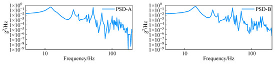 The time-domain strain data are converted to stress time-domain data, followed by autocorrelation processing. Fourier transformation is then applied to obtain the stress response PSD curve for each measurement point. The experimental and simulated PSD curves are compared, as shown in Figure 21.