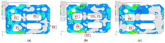Fixed plate B plate RMS stress: (a) Fixed plate B plate X-axis RMS stress; (b) Fixed plate B plate Y-axis RMS stress; (c) Fixed plate B plate Z-axis RMS stress.