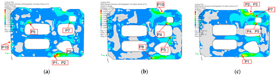Fixed plate A plate RMS stress: (a) Fixed plate A plate X-axis RMS stress; (b) Fixed plate A plate Y-axis RMS stress; (c) Fixed plate A plate Z-axis RMS stress.