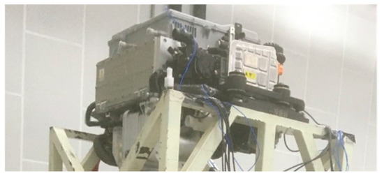 The random vibration test aims to assess the stress at critical points of the fuel cell system, validate the finite element model results, and provide a basis for parameter correction. Due to the large mass and volume of the fuel cell system, a unidirectional excitation platform, as shown in Figure 17, was employed. This platform consists of an expansion platform, a fixed platform, a ground base, and an excitation cylinder. The fuel cell system is bolted to the fixture at the suspension bracket, which is then connected to the vibration platform.