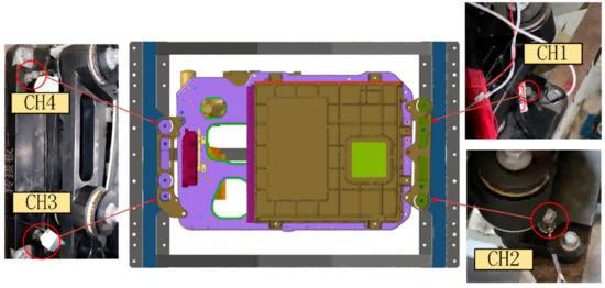 Prior to testing, the sensitivity of the acceleration sensor and strain gauge must be calibrated, followed by system debugging. To ensure a secure connection between the fixture and the expansion table, an acceleration sensor is installed at the junction of the fixture’s suspension bracket and the fuel cell system, as shown in Figure 19. Z-direction acceleration sweep excitation is applied via the excitation table, and the acceleration responses at four fixture locations are recorded.
