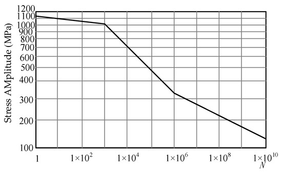 The fixed plate assembly is fabricated from 510 L steel, commonly used in automobile beams. Its chemical composition includes iron, carbon, manganese, and silicon, with low carbon content and higher levels of manganese and silicon, along with trace amounts of alloying elements like chromium, niobium, and vanadium. The material’s internal structure is ferrite-pearlite, and its estimated fatigue limit is 0.38 × Su, with a fatigue life of 106 cycles. Based on the low-cycle fatigue limit (S1000) and high-cycle fatigue limit (Sbe), the S-N curve for 510 L steel is estimated, as shown in Figure 22. The Miner linear damage accumulation rule is applied, with the Goodman mean stress correction used for the fatigue calculation.
