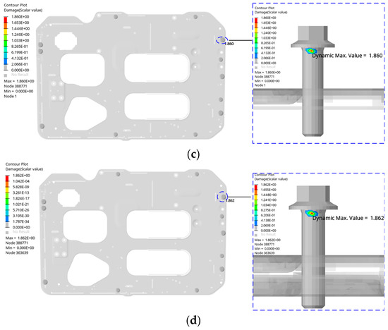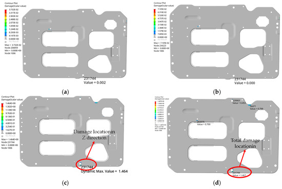 Fatigue damage of fixed plate: (a) Fatigue damage under X-axis vibration; (b) Fatigue damage under Y-axis vibration; (c) Fatigue damage under Z-axis vibration; (d) Total fatigue damage.