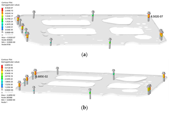 Under bolt preload, the stress frequency response function of the fuel cell system from the excitation point to the bolt is derived. The bolts used are M10-8/SWRCH35K, with material parameters provided in Table 7. By mapping the GB/T 2423.43 “Safety Requirements for Power Batteries for Electric Vehicles” standard through nCode and applying the corresponding PSD curve, the fatigue life of the bolts is evaluated, as shown in Figure 25. Under X-axis vibration, the stress remains below the bolt’s fatigue limit, indicating no fatigue damage. Under Y-axis vibration, the maximum fatigue damage of the X6 bolt connecting the fixed plate to the suspension bracket is 0.06, which is minimal, suggesting a low likelihood of fatigue failure. However, under Z-axis vibration, the X4 bolt’s fatigue damage reaches 1.86, indicating imminent failure due to fatigue under these conditions.